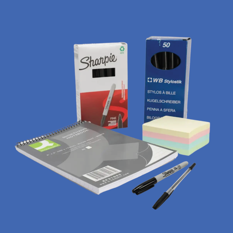 انواع مختلف نوشتافزارها شامل خودکارها، رواننویسها، مدادها، کاغذ، دفتر، و وسایل جانبی